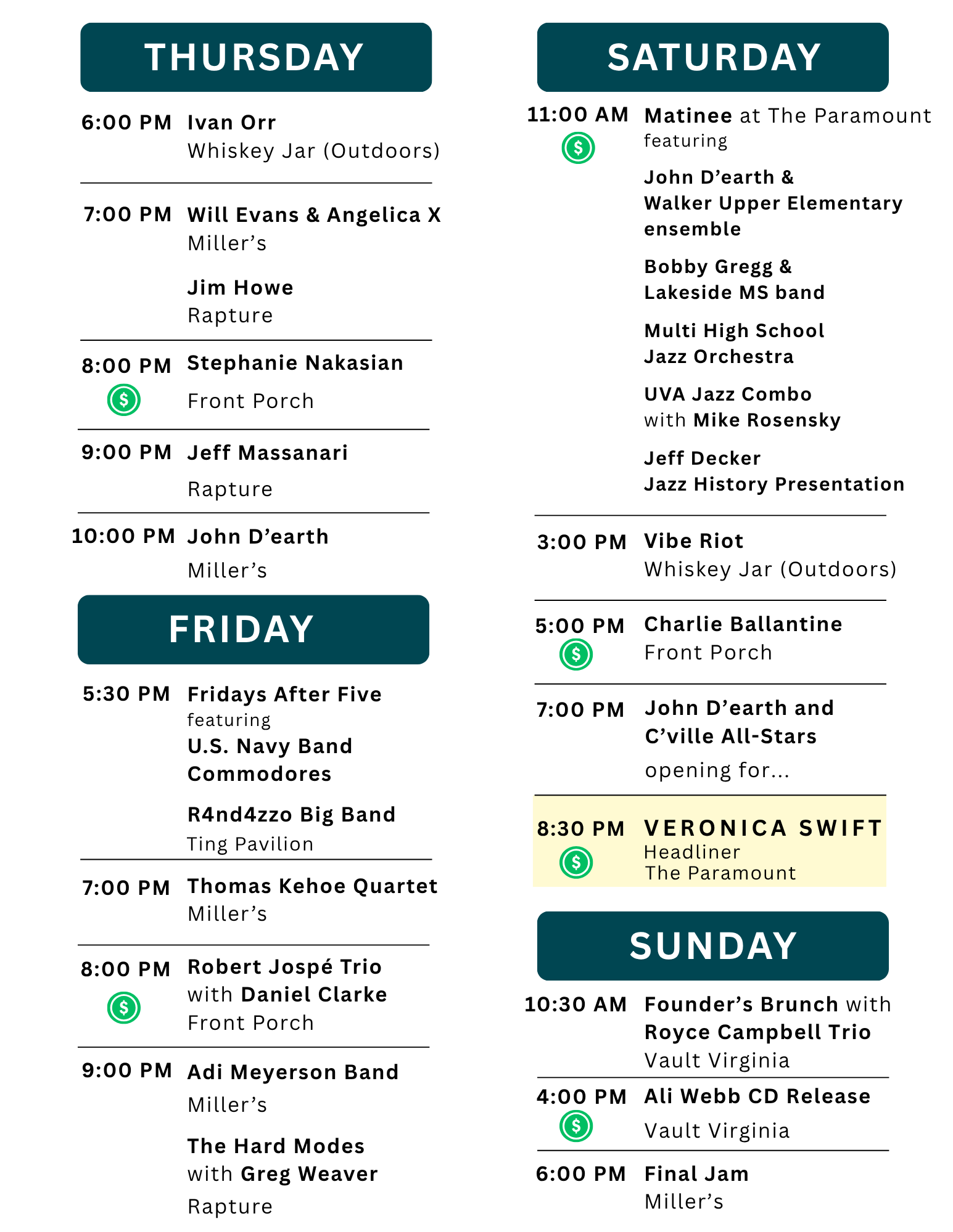 Multiple stages in the Downtown Mall area will host special events with outstanding artists and the festival will feature a two-night/multi-venue Club Circuit with no cover charges.